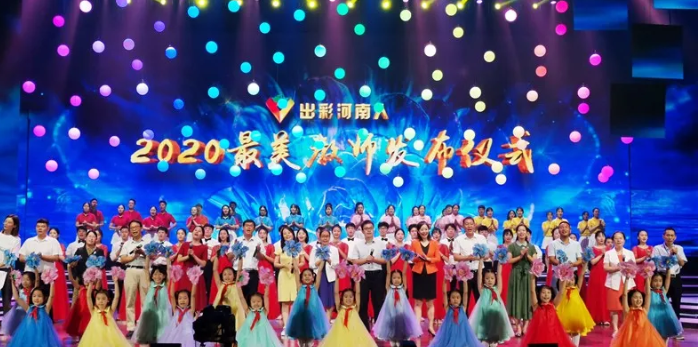 河南卫视播出的《出彩河南人--2020 “河南最美教师”发布仪式》采取先介绍“河南最美教师”的先进事迹,在给老师颁奖的方式,先后介绍了12位“河南最美教师”的典型事迹,颁奖场面庄严而热烈,尊师重教氛围浓厚。12位“河南最美教师”其中,有在国家危难时刻挺身而出、奔赴抗疫一线的“抗疫侠侣“李霞黄志昂夫妇;有在抗疫保卫战中爱生如子,冒着生命危险保护学生平安返校的洛阳科技职业技术学院的辅导员麦陆南老师;有在抗疫攻坚战中坚守工作岗位,坚持上好网课,爱岗敬业、无私奉献的胡金吾、王晓林、尚宇红、王红玉、贾福霞等优秀教师;有不念繁华、幸福守望、为乡村教育事业无私奉献的老教师童长窝。