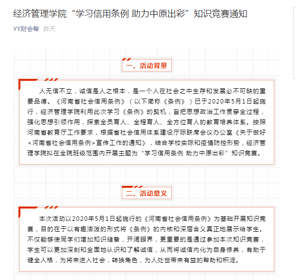 为进一步增强我院全体师生信用意识和诚信观念,加强《条例》宣传工作,在营造学条例、用条例、守条例的浓厚氛围,使信用知识入脑入心,我院在学校的统一部署下组织开展《河南省社会信用条例》宣传教育活动。
