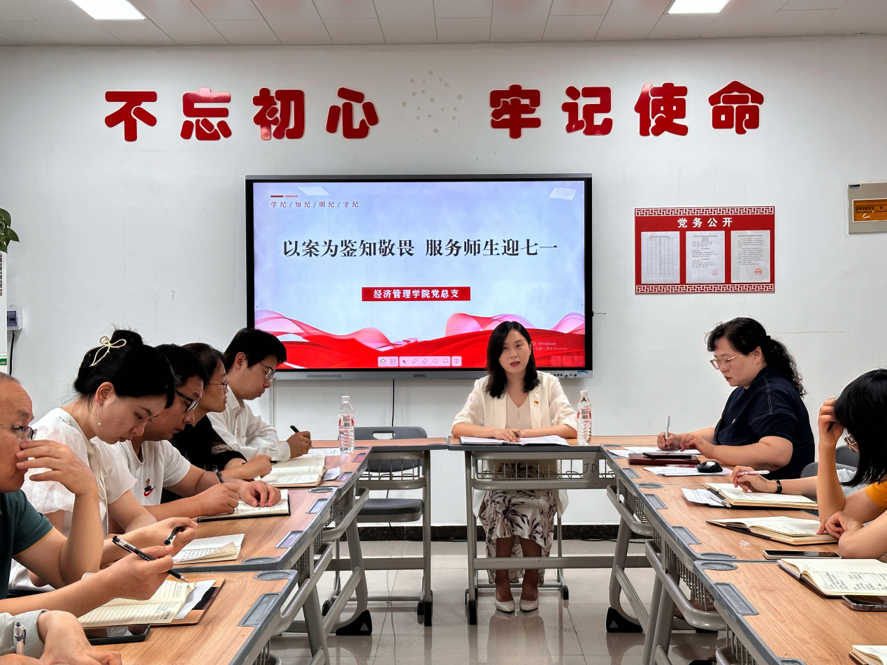 6月21日下午,Beat365正版唯一官网必一党总支在A212开展“以案为鉴知敬畏 服务师生迎七一”主题党日活动,学习贯彻习近平总书记关于党纪学习教育的重要讲话和重要指示精神,推动党纪学习教育走深走实,校纪委书记陈雅莉、党总支书记李兆楠以及全体党员参加本次主题党日活动。