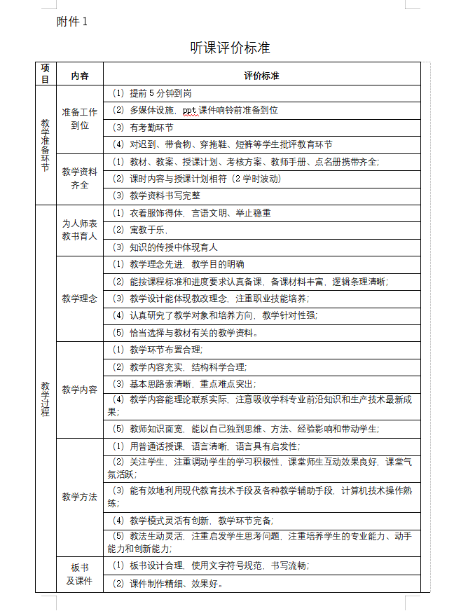 1.院长、副高级及以上职称教师、教学办主任、教研室主任、每学期按组别听课,填写附件1听课评价标准;
