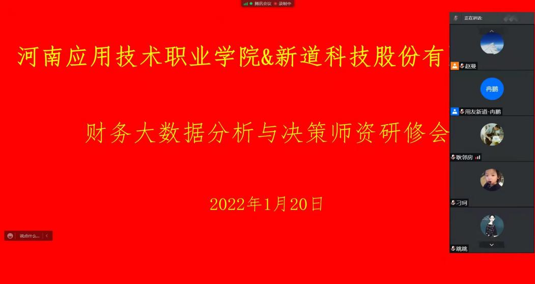 大数据采集、挖掘与分析等新型信息技术的快速发展,对高校的财会专业建设提出了全新挑战,为了促进大数据技术与财会专业教学的有机结合,提高Beat365大数据与会计、大数据与财务管理的专业教学质量,2022年1月20日,Beat365正版唯一官网必一财务管理和会计教研室的全体专兼职教师参加了由新道科技股份有限公司主办的财务大数据分析与决策线上培训。