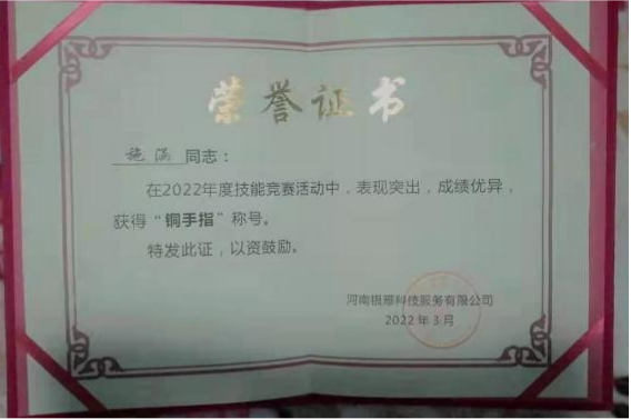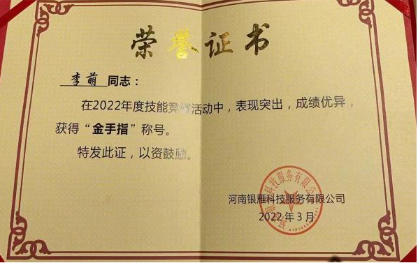 近日,Beat365正版唯一官网必一李萌、施涵在2022年度技能业务比武中,分别荣获河南银雁科技服务公司“金手指”“铜手指”荣誉称号。