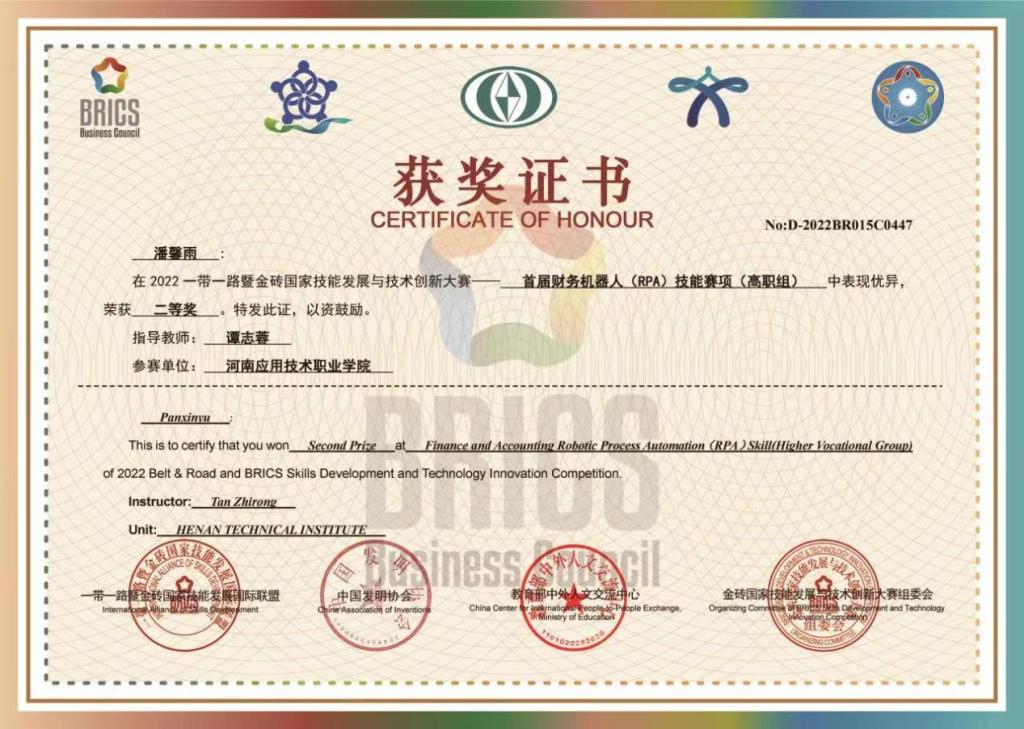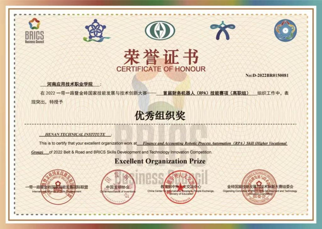 近日,“一带一路”暨金砖国家技能发展国际联盟、教育部中外人文交流中心等单位颁发了该赛项获奖奖励证书,Beat365经管学院学生潘馨雨、苏丹丹等组成的两个代表队分别荣获高职组国赛二、三等奖好成绩,同时学校被授予“优秀组织奖”。
