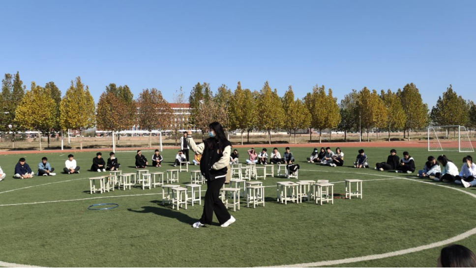 活动以“抢坐板凳”游戏开始,大家跟随音乐节拍小碎步慢跑,当音乐停止,所有学生奔赴“板凳”,没有坐到“板凳”的同学视为淘汰。大家在加油声中奋起直追,一时间操场上欢声笑语。