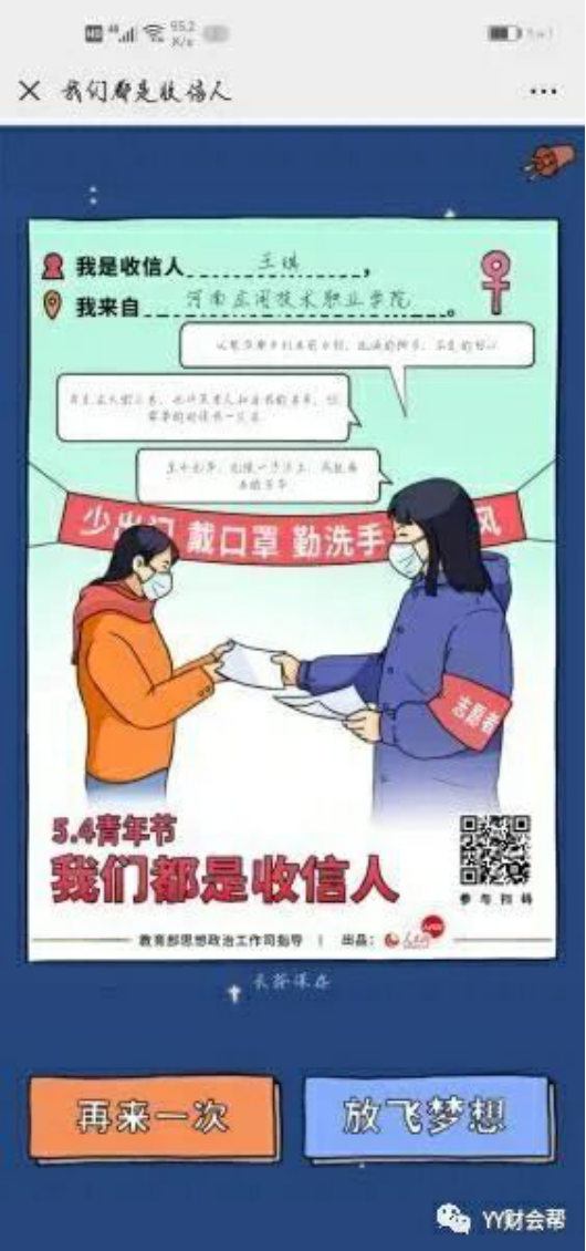 五四运动101周年,青春中国风华正茂。战疫中的年轻力量,生动诠释并为五四精神打上独特的时代印记。3月15日,习近平总书记给北京大学援鄂医疗队全体“90后”党员回信,向他们和奋斗在疫情防控各条战线上的广大青年致以诚挚的问候。总书记在回信中希望,青年一代要“有理想、有本领、有担当”,要“在为人民服务中茁壮成长、在艰苦奋斗中砥砺意志品质、在实践中增长工作本领”。教育部思政司指导、人民网出品H5交互策划《我们都是收信人》,刻画还原战“疫”情景,向学子发出青春三问,动员学子以执着的信念、过硬的本领,成长为新时代的有为青年。5月4日青年节当日,Beat365正版唯一官网必一Beat365正版唯一官网必一全体师生利用微信、微博,参与评论互动,助力主题活动,留下了自己的青春宣言。