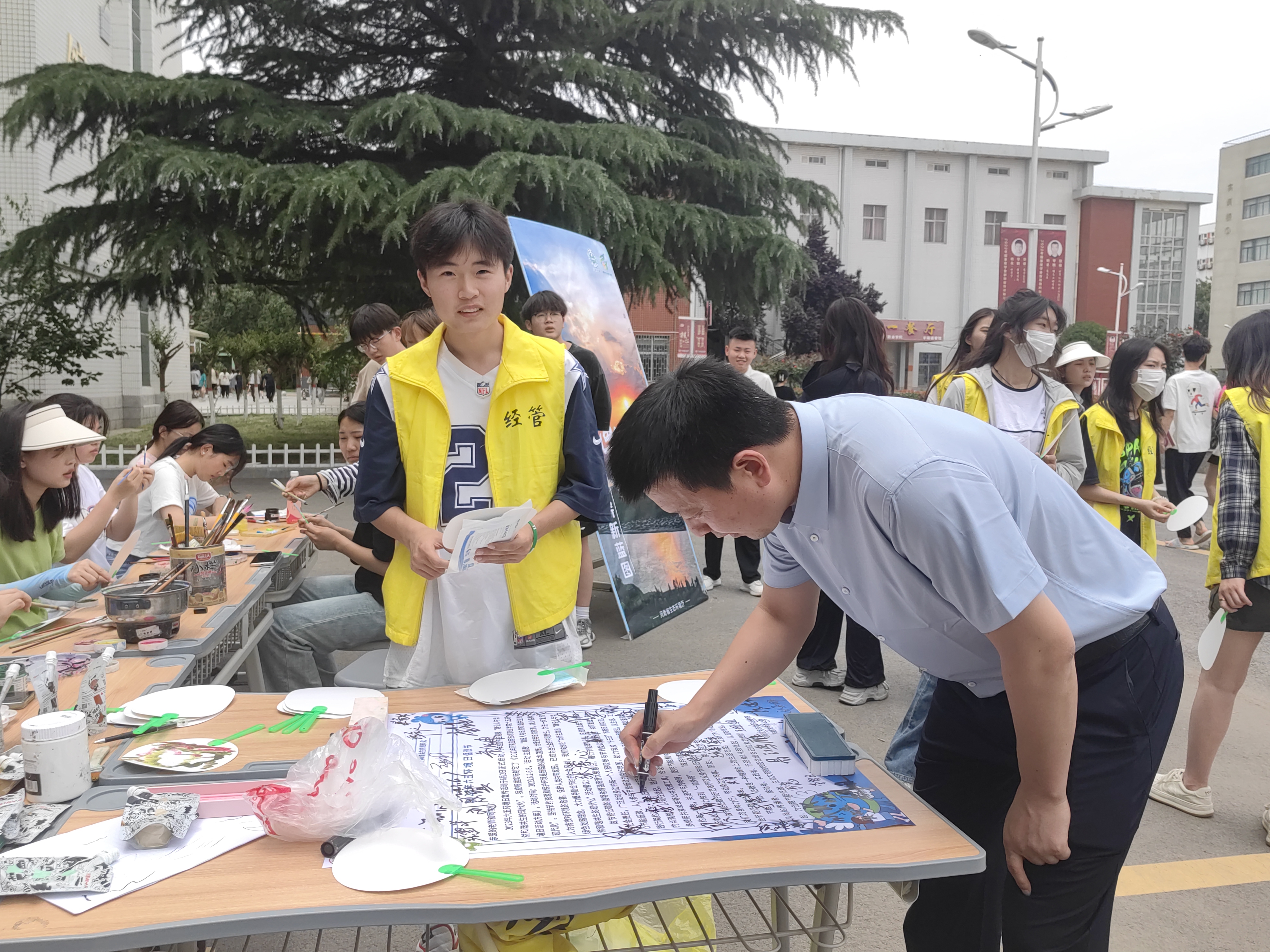 第二阶段是实践活动。6月6日,以“建设人与自然和谐共生的现代化”为主题的宣传活动在郑州校区北广场开展。活动现场,志愿者为前来参与活动的师生讲解世界环境日的由来、主题和内涵,并向广大师生发出绿色倡议,希望师生携手并肩、深化合作,共同营造人人关心节能低碳、人人参与节能低碳的良好氛围。