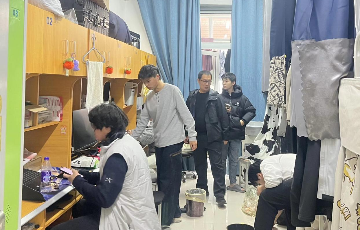 走访过程中,学院领导与同学们亲切交流,细致询问大家的日常生活、学习状况与实际困难,叮嘱学生注意冬季防寒保暖、合理安排作息,鼓励大家营造和谐友爱的宿舍氛围。同时,检查小组重点排查宿舍卫生状况、消防设施及违禁物品存放情况,尤其对男生宿舍进行细致检查。检查发现,绝大多数宿舍环境整洁、秩序良好,但个别宿舍存在物品摆放杂乱、卫生清洁不彻底等问题,检查小组当场提出整改意见并督促限期整改。王倩指出,辅导员要定期深入宿舍,及时掌握学生思想动态与需求,主动解决困难。此外,要加强安全宣传与文明养成教育,引导学生增强安全意识、自觉维护宿舍卫生。