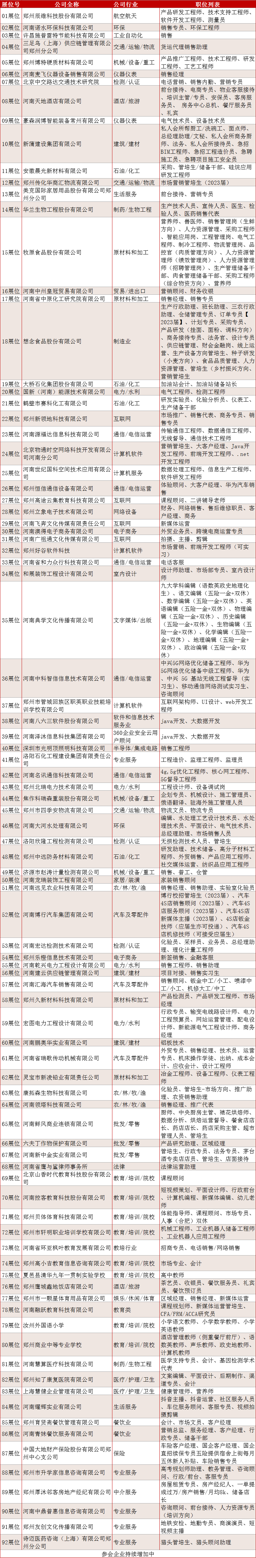 截至目前,已有牧原食品股份有限公司、想念食品股份有限公司、大桥石化集团股份有限公司、河南中州皇冠贸易有限公司、新蒲建设集团有限公司、安徽晨光新材料有限公司等90余家国企、上市公司和知名企业报名参会,提供岗位4700余个。
