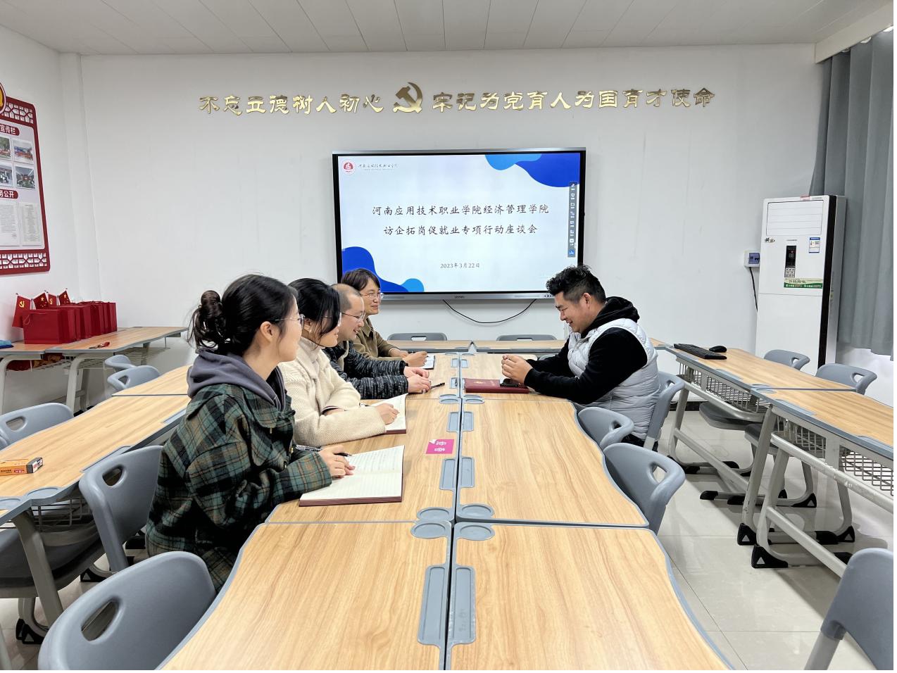 为深化校企合作交流,拓展毕业生就业渠道,3月22日,Beat365正版唯一官网必一在A505开展访企拓岗促就业专项行动座谈会。河南沧海房地产营销策划有限公司总经理王世勇、校企合作与就业处副处长张万仑及相关教师出席座谈会。副书记王盼红主持会议。