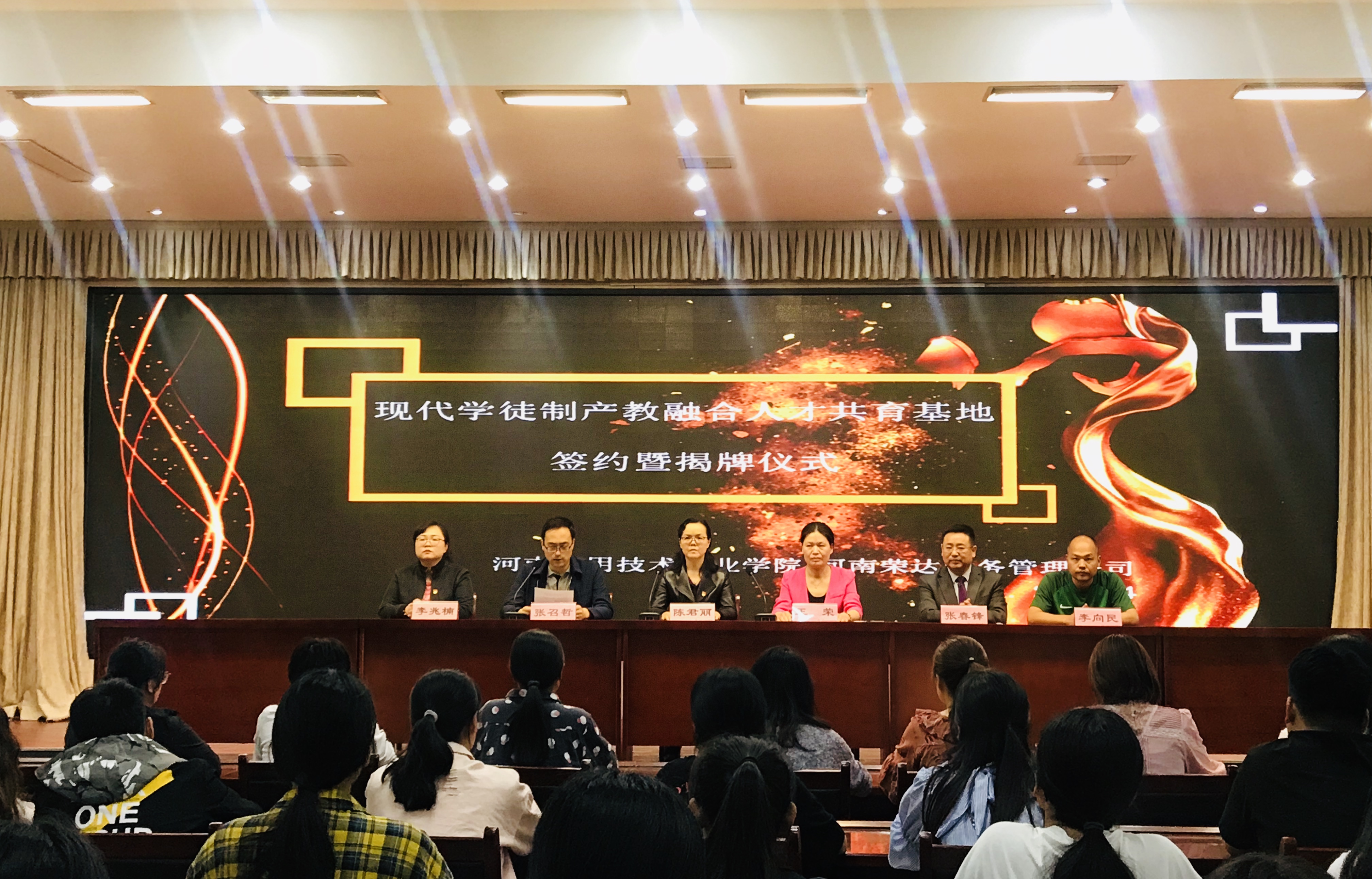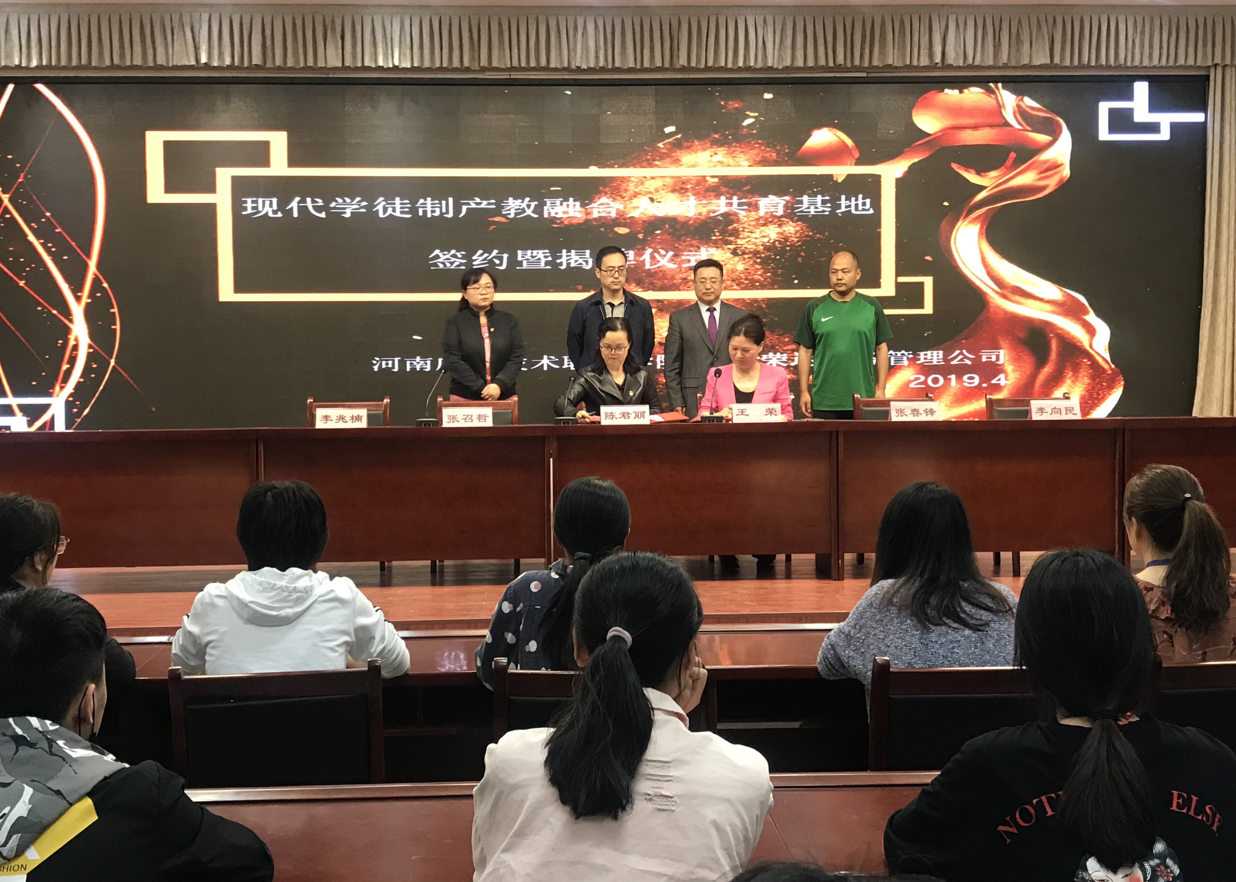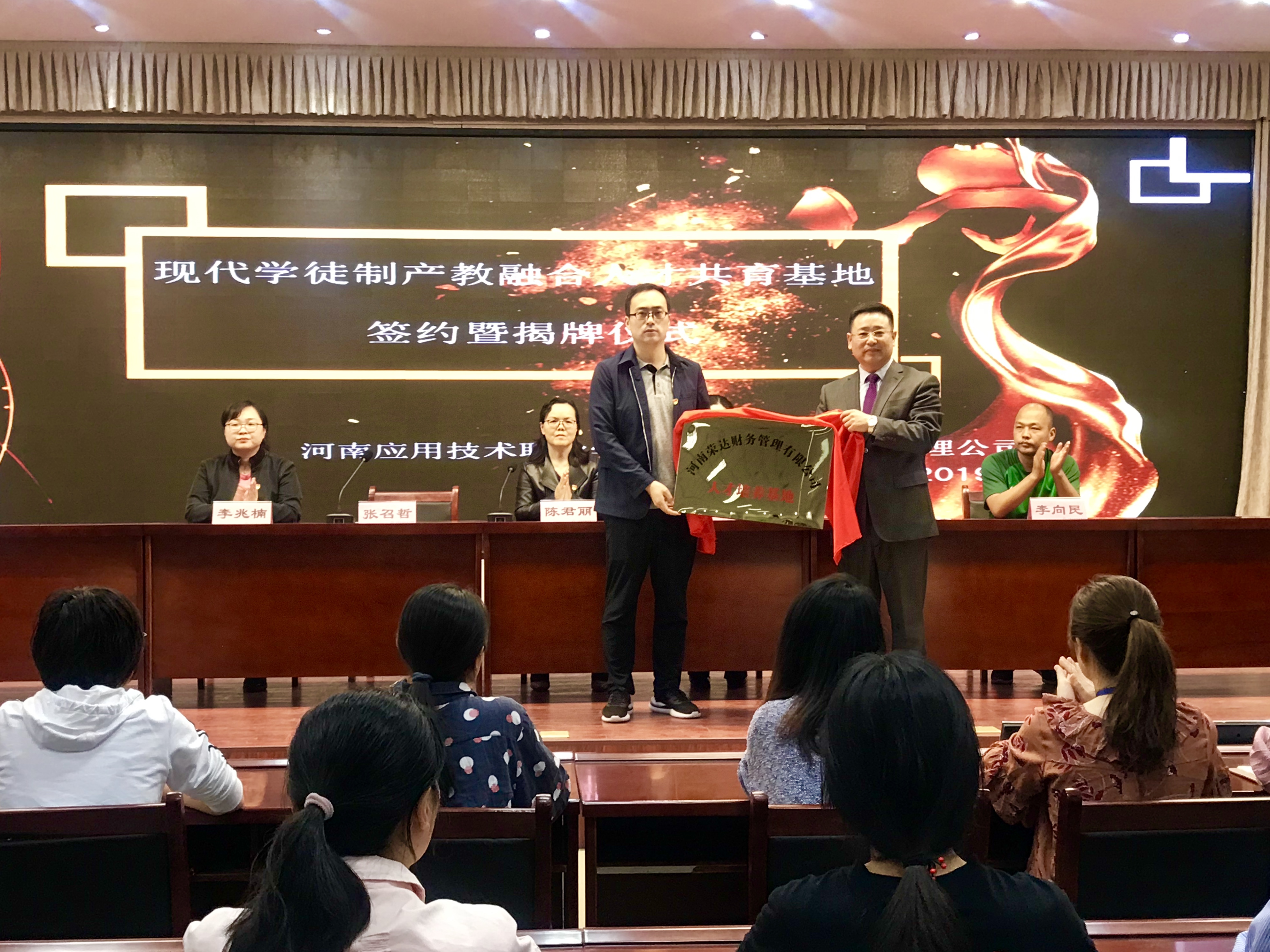 2019年4月18日,Beat365正版唯一官网必一与河南荣达财务管理公司在实训楼二楼会议室举行现代学徒制产教融合人才培养基地签约暨揭牌仪式。出席签约仪式的有学校副校长陈君丽教授、招生就业处李向民处长、Beat365正版唯一官网必一张召哲院长、党总支李兆楠书记、荣达财务管理公司王荣董事长、张春锋总经理及Beat365正版唯一官网必一的全体教师和学生代表。