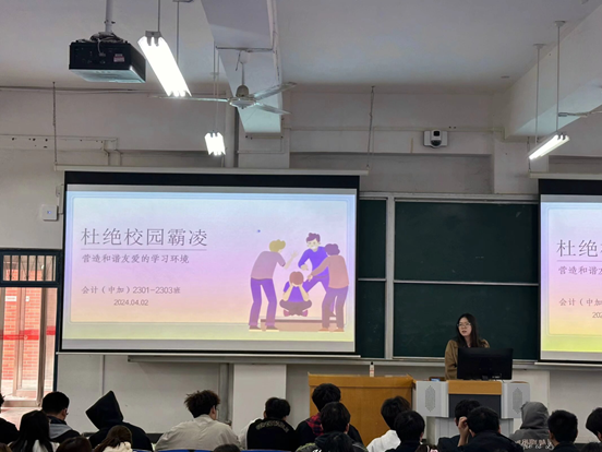 班会上,辅导员以3月10日河北邯郸初中男孩遭同学霸凌事件为案例,给同学们讲解了校园霸凌的概念、表现形式以及应对方法。校园霸凌是指在学校环境中发生的一种持续性、重复性的恶意行为,包括身体、言语、社交或网络上的攻击和侵犯。当面临校园霸凌时,要学会保持冷静、寻求帮助、保护自己等。此外,辅导员指出,校园欺凌是一种违法犯罪行为,有相关法律依据与制裁,希望大家保持敬畏,对校园霸凌坚决说“不”。期间,辅导员还给同学们推荐了反校园霸凌的影视作品,如《保你平安》《少年的你》《第二十条》等。