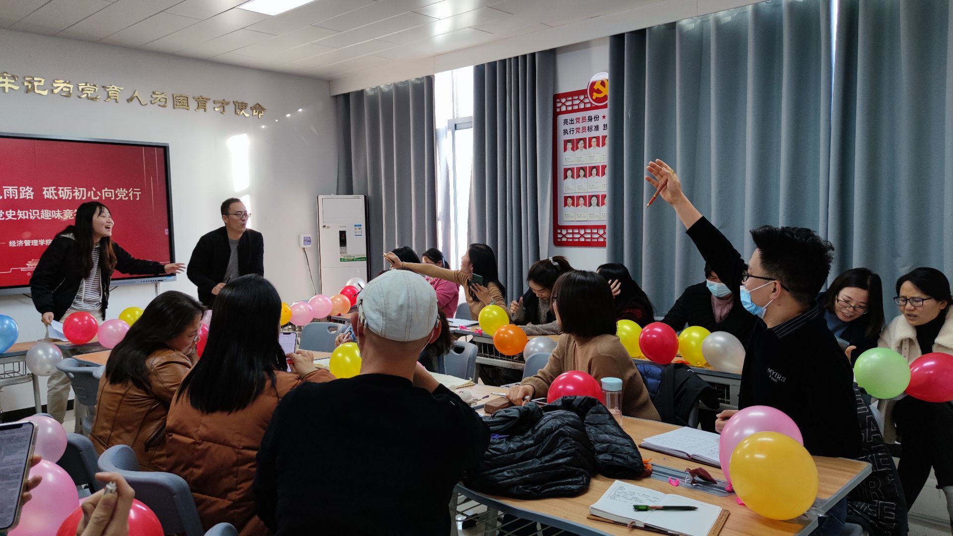 在“趣味竞答”环节,随机抽取题库中的任一题目,全体教师现场以扎破气球为示进行抢答。对作答优秀的同志颁发奖品,增加了学习活动的趣味性。活动现场广大党员及教师踊跃参加、热情高涨,氛围浓厚。