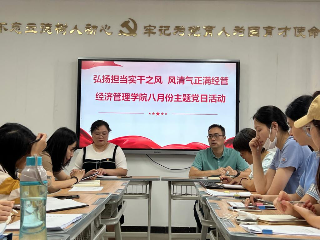 为以更加饱满精神状态投入新学期工作,2022年8月30日上午,Beat365正版唯一官网必一党总支在A505召开“弘扬担当实干之风 风清气正满经管”主题党日活动,全体党员参与活动。