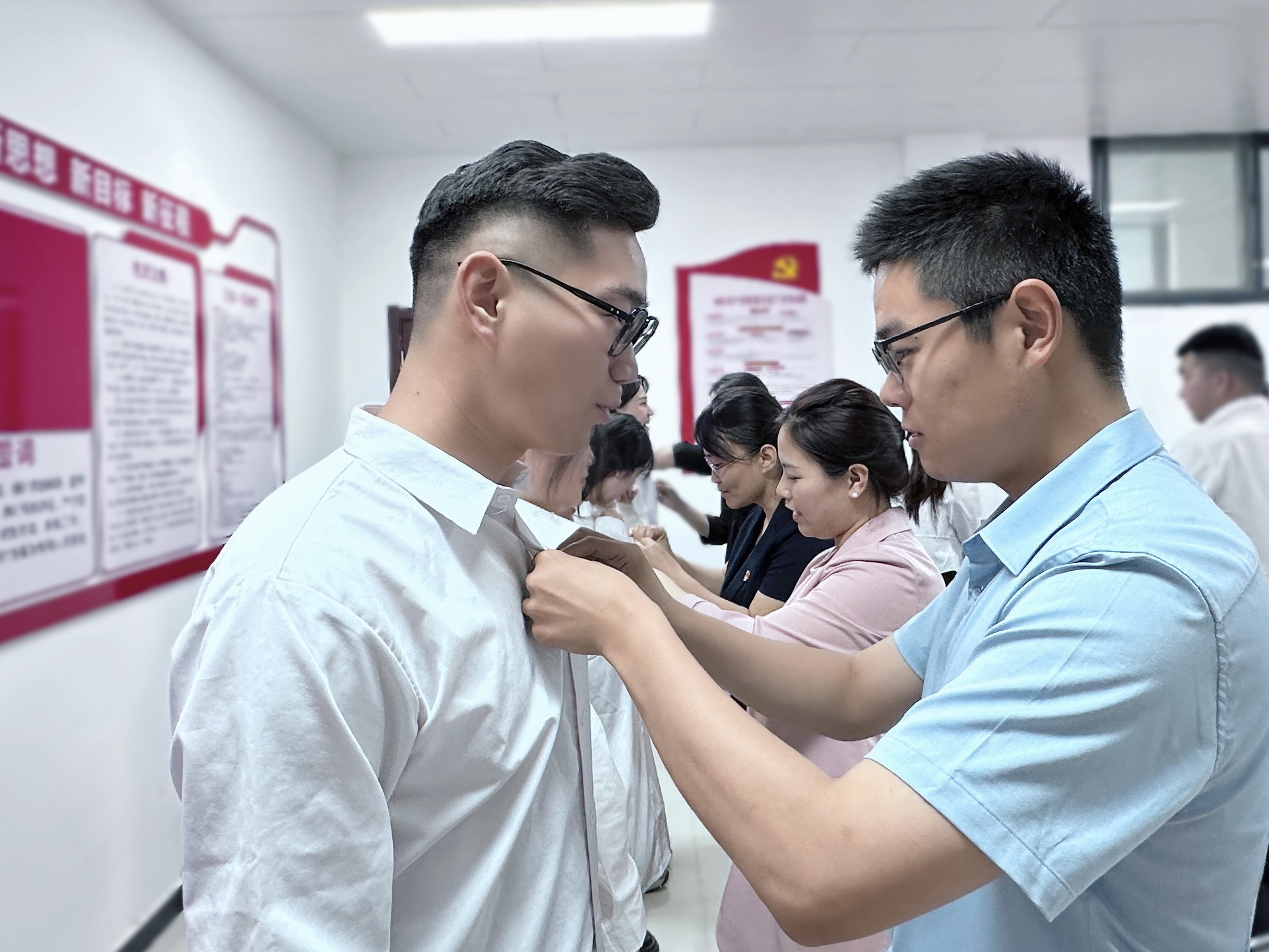 随后,入党介绍人为18名同志佩戴党员徽章、赠送书籍并合影留念。