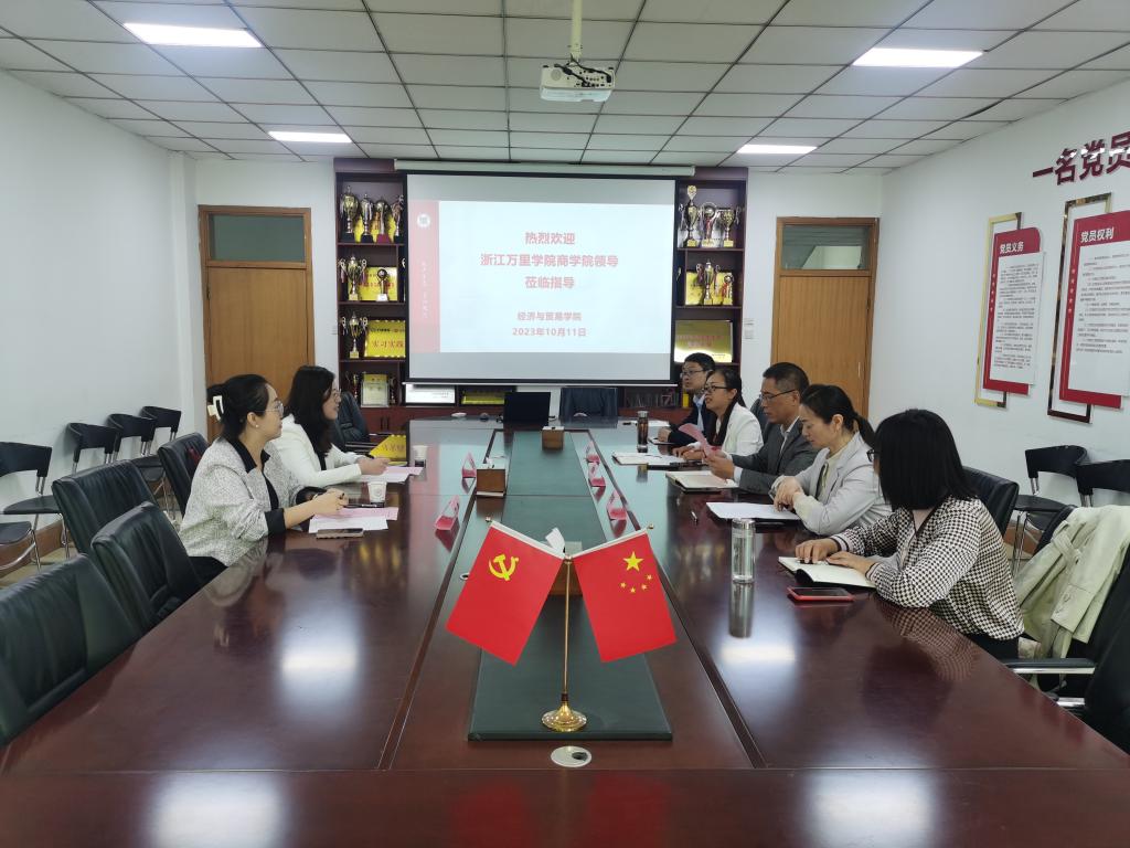 10月11日上午,浙江万里学院商学院院长助理孙彤、研究生党支部书记艾静一行2人来pp电子调研考察,旨在进一步加深两院之间的交流与合作,探索更先进的人才培养模式。交流座谈会在英才校区教学楼327会议室进行,院党委副书记贾艳艳,副院长杜玲、孙晓林及相关科级干部参加了会议。