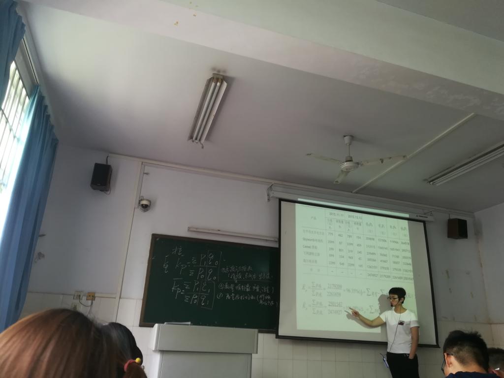 本次观摩课由石岩老师授课,授课内容为《统计学》中综合指标的编制一节。石老师首先带领学生回顾上节教学内容,接着以研究淘宝部分商品销售价格和销售量的变动为例,开展本次课程的主要内容。在课堂上石老师既重视理论讲解,又引导学生思考问题,并带领学生一步步解答问题,在师生共同的协助下,完成综合指数的编制。通过实例分析和逐步解答,不仅让学生真正理解综合指数的概念和作用,更让学生扎实掌握综合指数的编制过程这一重要的知识点。