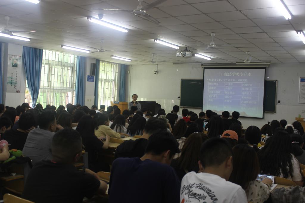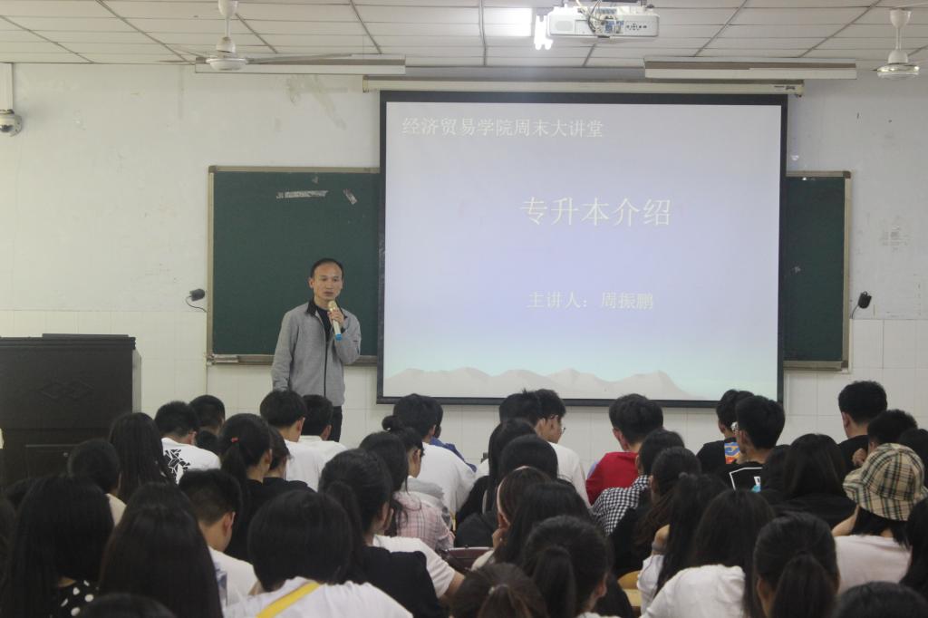 为帮助2018级学生了解更多专升本信息,做好未来的学习规划,经济贸易学院于5月9日下午2点半在W103教室举办了专升本专题讲座。此次讲座由pp电子经济学教研室主任周振鹏老师主讲,18级国贸一班、国贸二班、国贸跨境的全体专科同学参加了讲座。