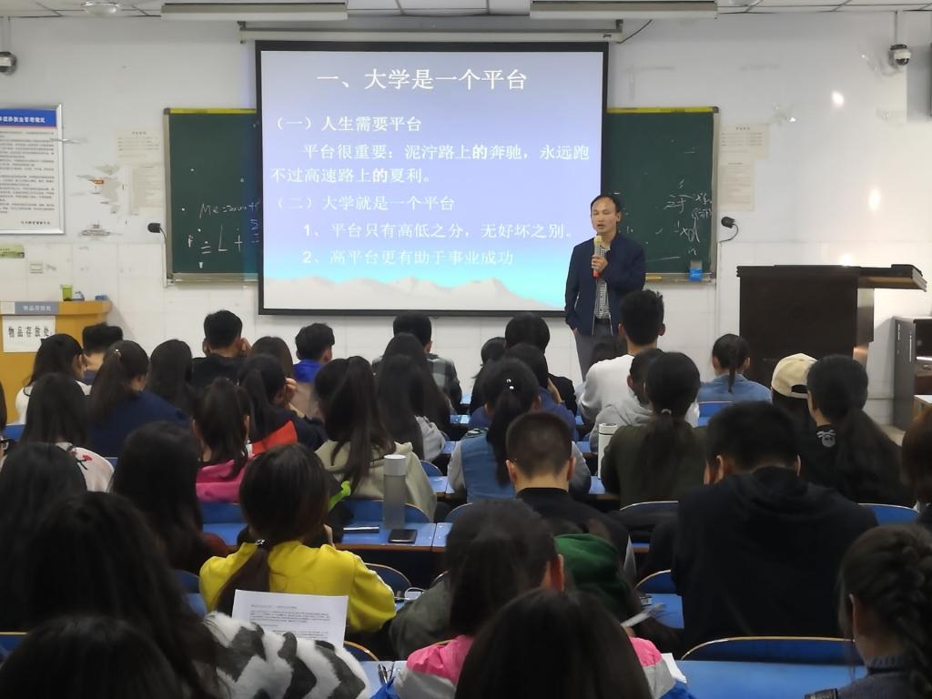 在讲座过程中,周老师从“大学是人生的一个平台”、“大学是青年人进行职业生涯规划的最佳时间窗口”、“大学生活的时间管理”三个方面讲解如何有效规划大学生活。周老师告诉我们平台很重要,平台没有高低之分,无好坏之分,更高的平台有助于事业成功。在时间管理方面,周老师向同学们介绍了按每学期、每月、每周、每天依次推进的分层次时间管理方法。周老师鼓励同学们,成功在于坚持,时间就像海绵里的水,只要你愿意挤就一定能挤出来,同学们要珍惜大学时光,合理的规划和利用大学时光。