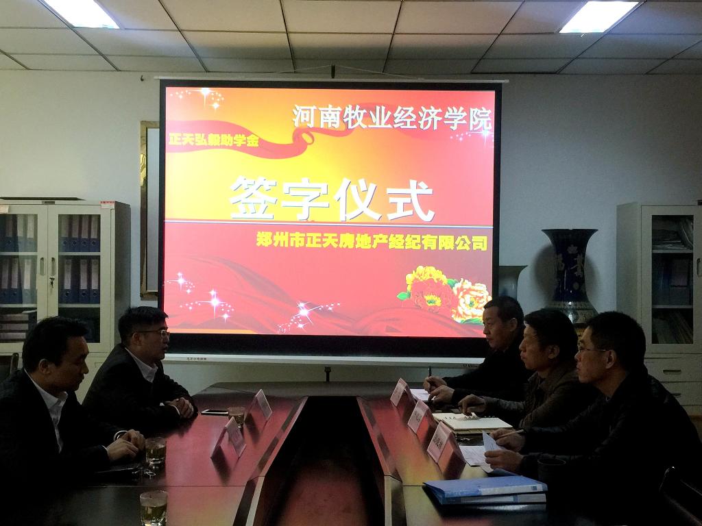 2016122日上午十时,在河南牧业经济学院经济贸易学院会议室,经贸学院和郑州市正天房地产经纪有限公司签订捐资助学协议,签字仪式的参加人员有经贸学院的李光院长、牛建绥书记、孙晓林副院长、正天公司总经理辛换城先生和后勤总经理周拥军先生。会议由孙晓林副院长主持。