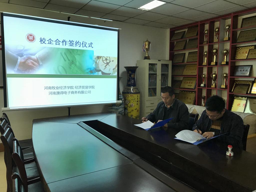 2017113日上午,经济贸易学院与河南澳得电子商务有限公司(简称“澳得电商”)在英才校区教学办公楼216会议室举行了校企合作签约仪式。  出席此次签约仪式的嘉宾有河南澳得电子商务有限公司总经理杨高飞和经济贸易学院院长李光,党总支书记牛建绥,党总支副书记田景丽,副院长高敏、孙晓林。