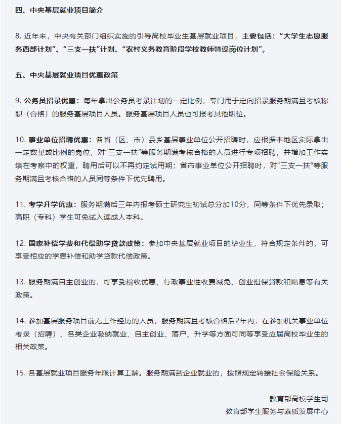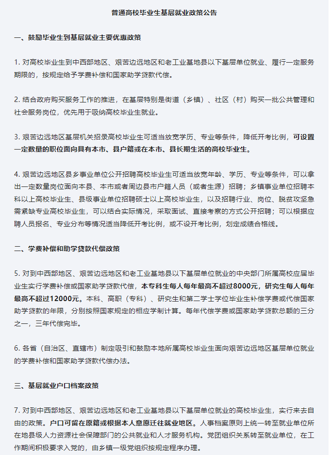 普通高校毕业生基层就业政策公告